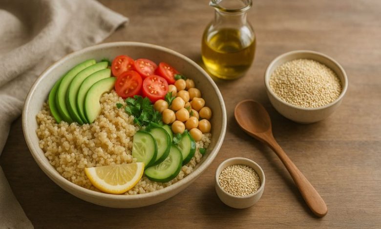 • Öğle: Kinoa + nohut + roka + domates + zeytinyağı + limon (Akdeniz kasesi).